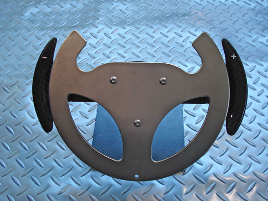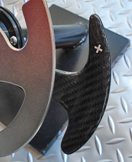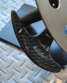純正のパドルシフトではステアリングを切った際でもパドルシフトレバーが固定されています。カーボンパドルレバーを装着すると切り込んだステアリングに連動してパドルレバーも同時に回転します。サーキット、スポーツ走行時のシフト操作を楽に行うことが可能です。 ステアリングボス付 \84,000 ステアリングボス無 \76,000 (MCR製)税抜価格